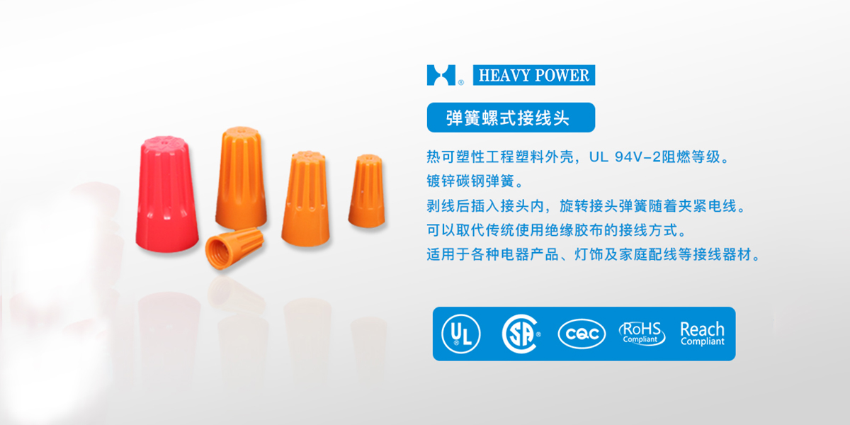 1.熱可塑性工程塑料成型外殼,UL 94V-2阻燃等級(jí)。2.鍍鋅碳鋼彈簧。3.電線(xiàn)剝線(xiàn)后插入接頭內(nèi),旋轉(zhuǎn)接頭,彈簧隨著夾緊電線(xiàn)。4.可以取代傳統(tǒng)使用絕緣膠布的接線(xiàn)方式。5.適用于各種電器產(chǎn)品、燈飾及家庭配線(xiàn)等接線(xiàn)器材。6.多色可選。